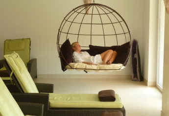 Einer der herrlichen Ruheräume befindet sich in der WellnessOase auf gleicher Ebene mit der Saunalandschaft. Aus diesem Ruheraum mit seiner weitläufigen Sonnenterrasse genießen Sie einen fabelhaften Blick ins Freie. Im Ruheraum der WellnessOase finden Sie zusätzlich ergonomische Wärmeliegen zum behaglichen Aufwärmen und wohligen Entspannen. Ebenso steht Ihnen hier ein großes Wasserbett mit Massagefunktion zur Verfügung. Eine Solarwiese (gegen Gebühr) mit hautfreundlicher und sanft bräunender UV-Strahlung erweitert das Angebot im Ruheraum der WellnessOase.
